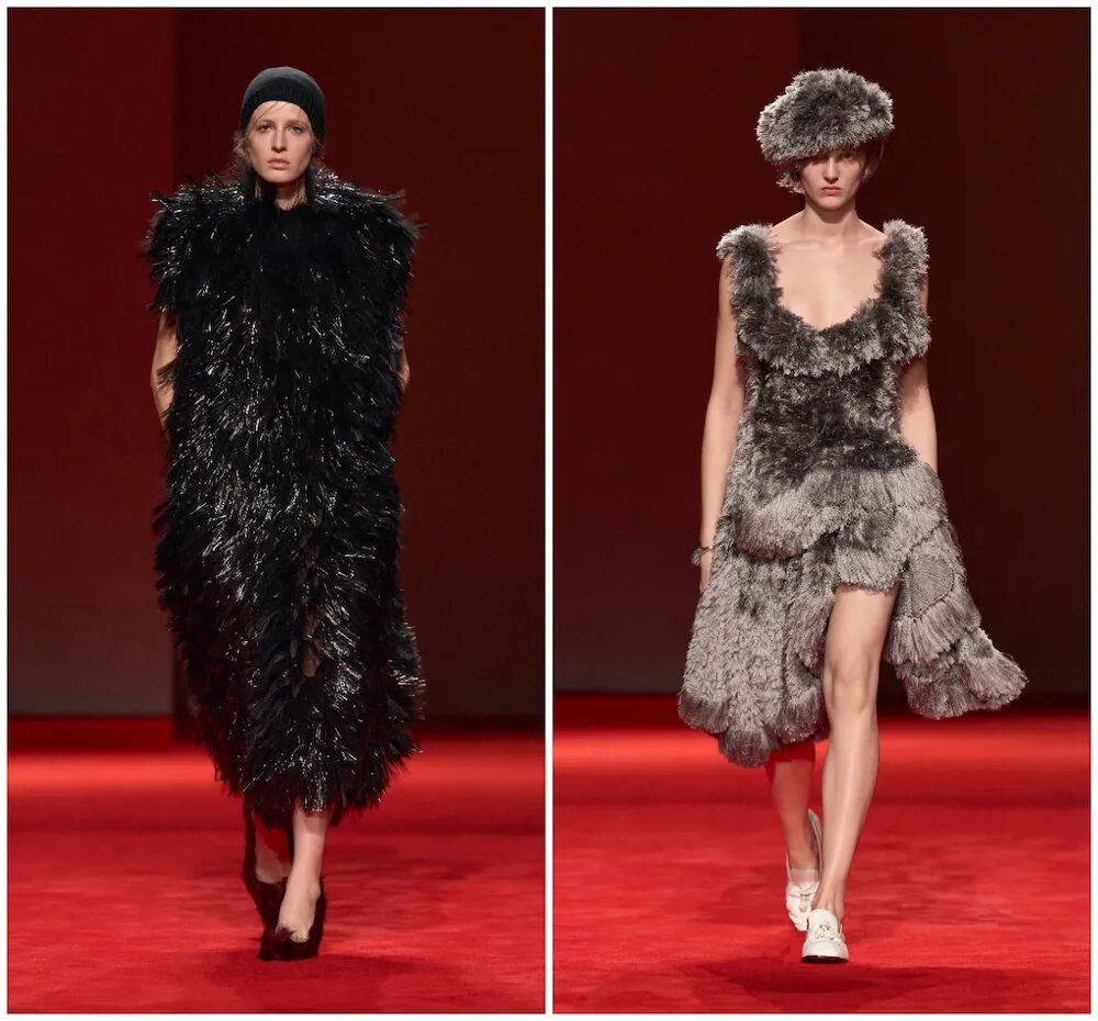 而在秀场后半部分,Louise Trotter 对材质的运用则更加突出:丝线经过处理后,像卷曲羊毛般的效果;蓬松的玻璃纤维则营造出酷似羽毛的视觉效果。