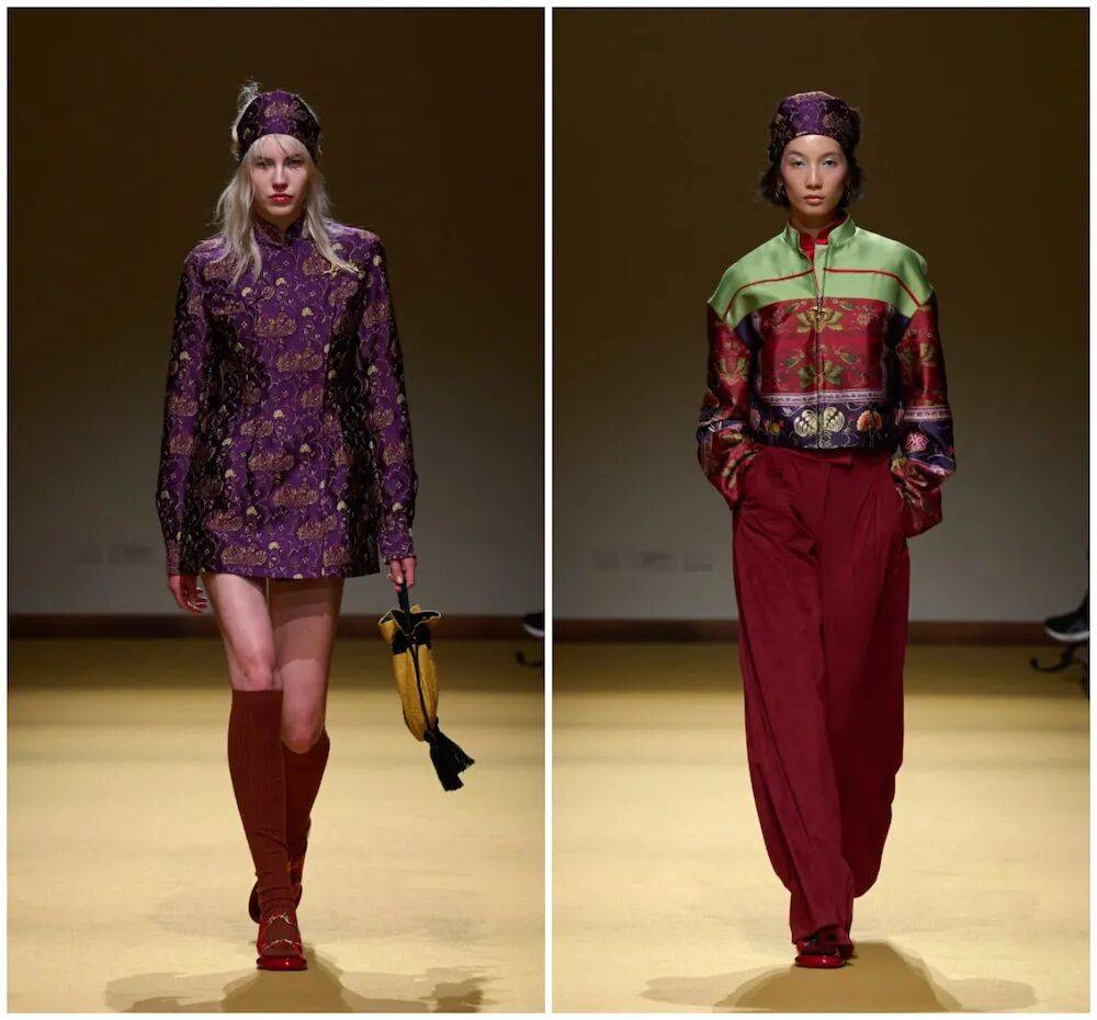 在新系列中,中国传统“女红”技艺——这一由女性传承的针线之工,被重新转译为一种当代的设计语言。同时中国传统刺绣与纹样也被全新演绎呈现在多套单品中。紫色提花的织锦等不同颜色或图案的头饰则贯穿整个系列。