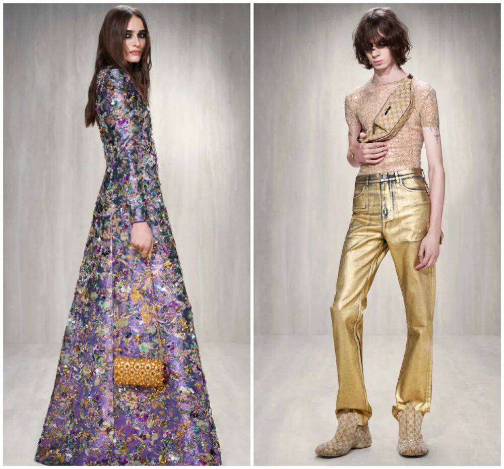 在自述中,Demna 指出:“Gucci是一个超级品牌,它既有务实的产品,也饱含充沛的情感。”因此在这个系列中,除了性感的单品,亦有以花卉印花面料为底、装饰立体刺绣的繁复裙装,部分贴身服装则选用了舒适的弹力面料或轻薄的桑蚕丝,例如弹力针织T恤、桑蚕丝紧身裤等。此外,多套造型将腰包挎于胸前,透露出 Demna 标志性的街头气息。